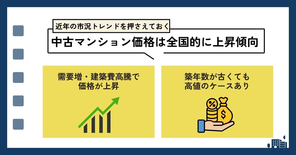 そして新築マンションの値上がりに連動するように中古マンションも価格が上昇しているため、とくに人気が高い築浅マンションについては、想定する価格よりも高く売れる可能性があるでしょう。