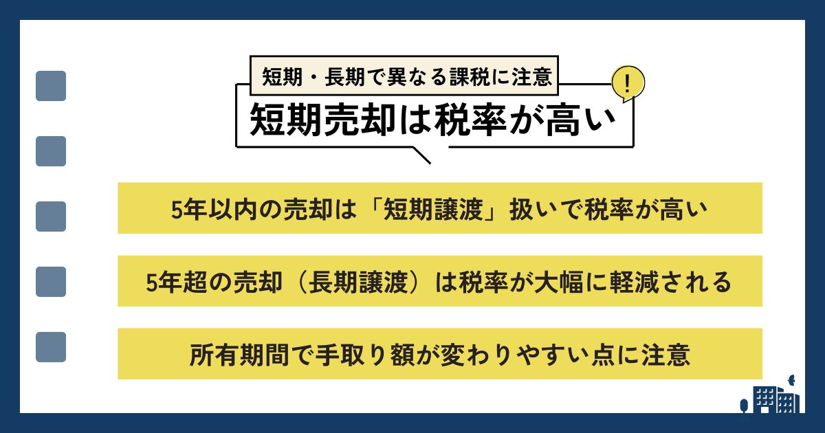 また売却によって利益が発生した場合は、譲渡所得税がかかります。3年で売る場合は短期譲渡所得なるため、税率が高くなります。