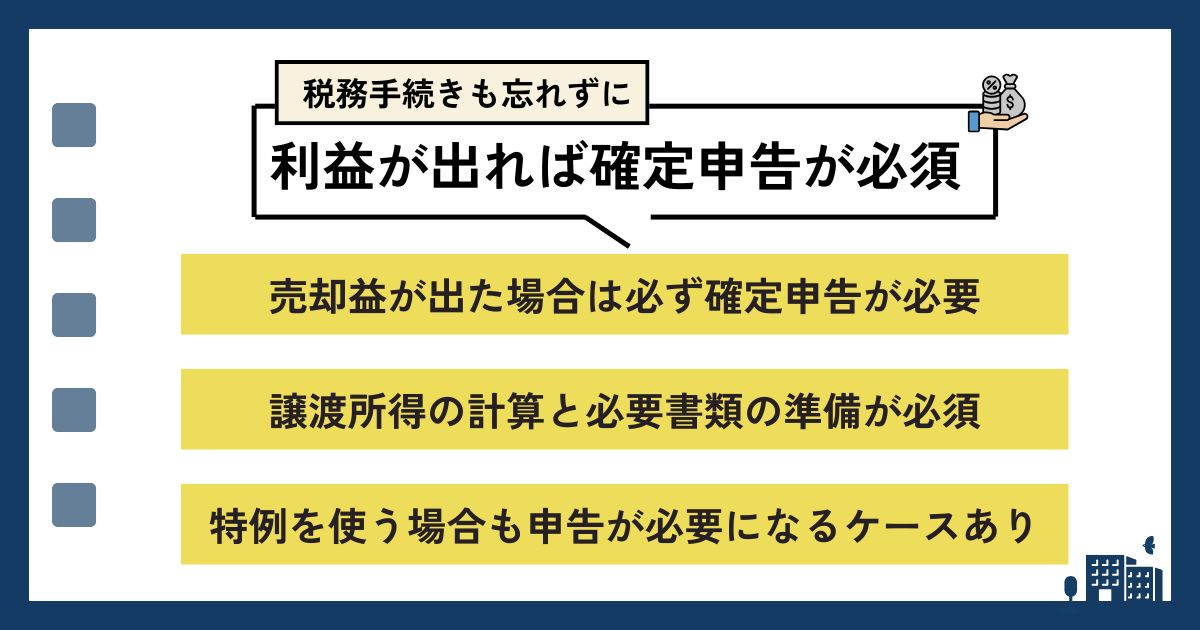 また税金の特例を利用する場合は、売却益の有無にかかわらず確定申告が必要です。タイミングによっては1年近く先になりますので、売買契約書など必要書類は保管しておき、忘れずに申告しましょう。