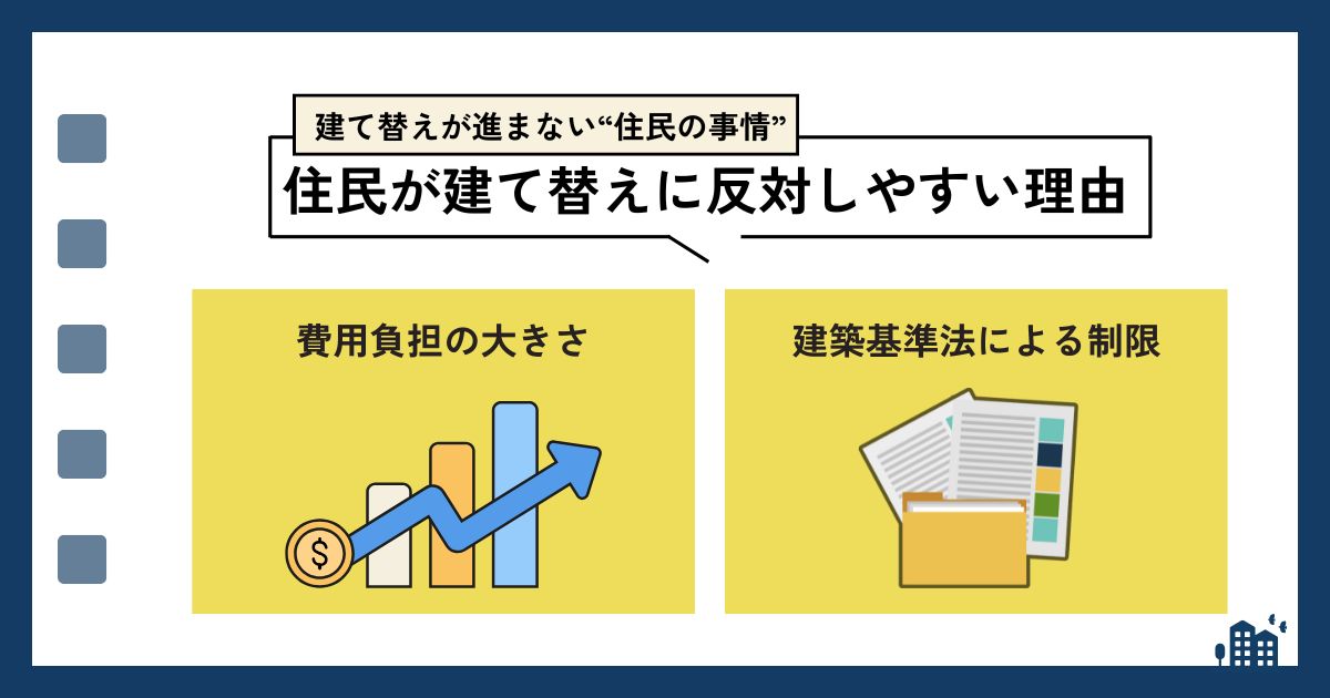 建て替えて同じ戸数を建てるとしても、今までより狭い空間で生活するようになるため、反対する方も多く、同意を得るのは難しい現状があります。