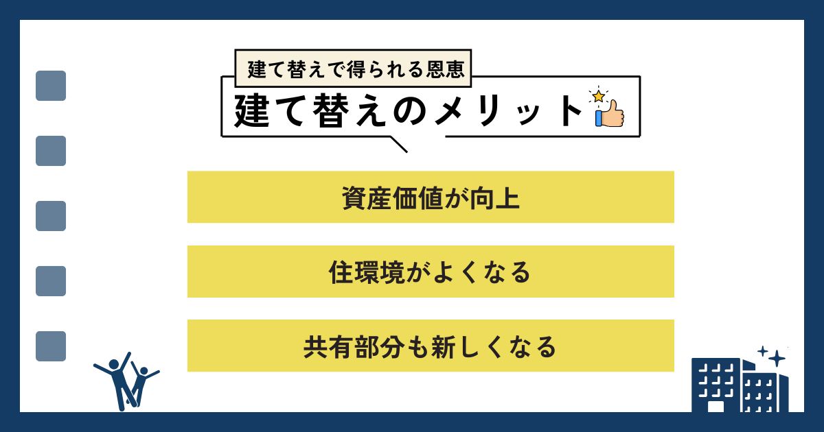 マンション建て替えは、住民の反対や建築基準法による制限があるため難しいものの、次のようなメリットがあります。