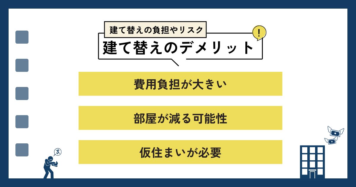ただし自己負担額が大きく、部屋が狭くなる可能性があるなどのデメリットもあるため、建て替えを検討する際は注意する必要があります。