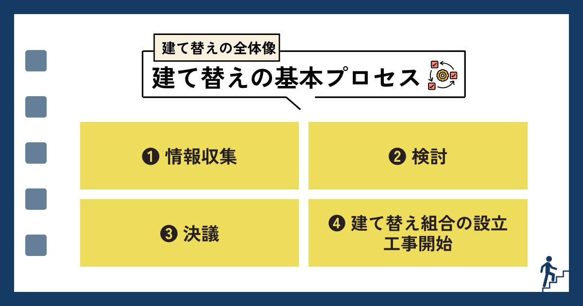 マンションの建て替えは、準備、検討、計画、実施の4つのプロセスに分かれ、目安として10年程度かかり、長ければ約20年かかるケースもあります。