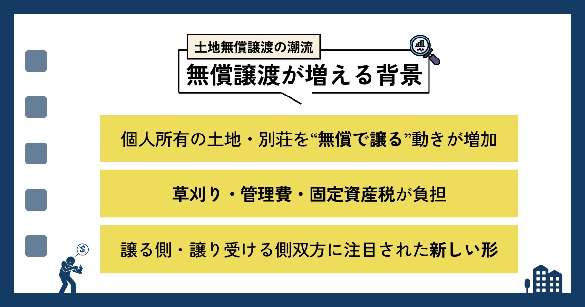 近年、所有者側の都合により「無償でもいいから土地を譲りたい」と考える方が増えており、千葉県でも同様の動きがあります。