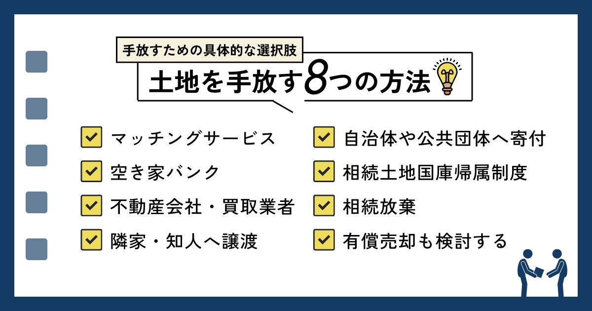 不要な土地を譲渡する主な方法は、次のとおりです。