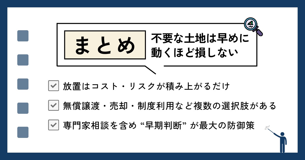 特に利用予定のない土地は、放置するほど維持コストや管理リスクが積み重なるため、早めに方向性を決めておくことが大切です。