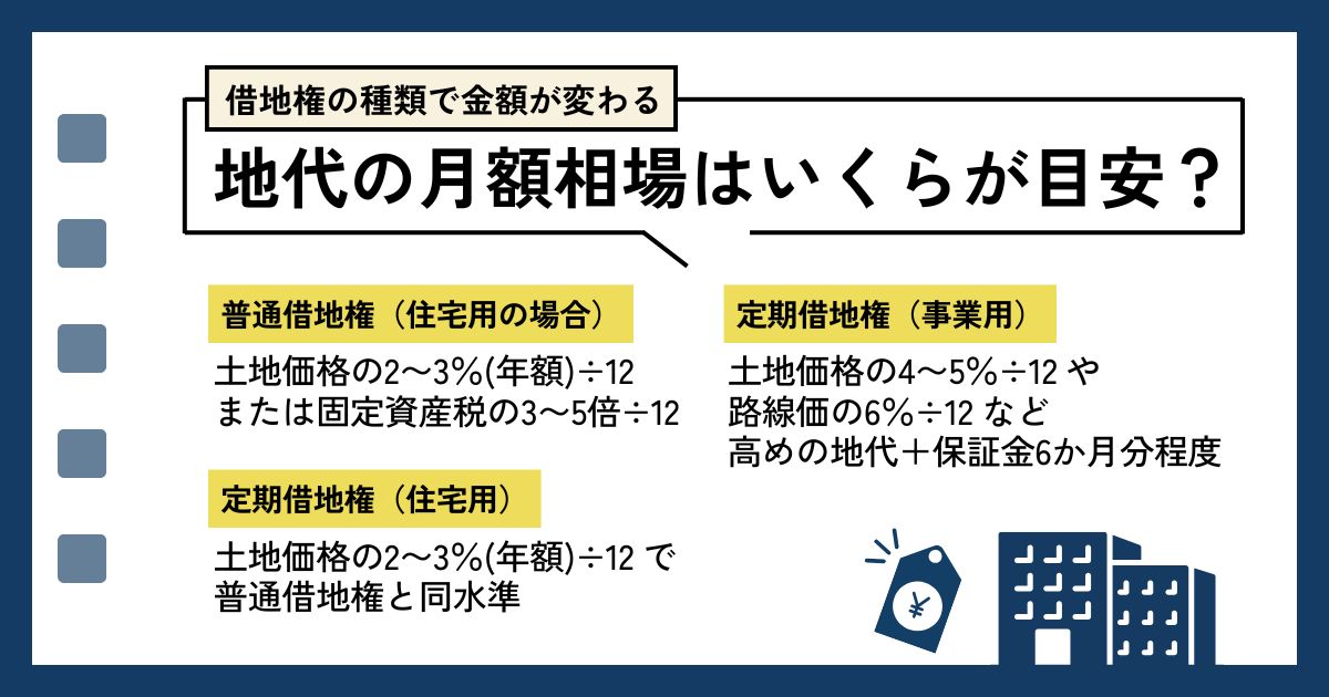 この章では、普通借地権・定期借地権(住宅用・事業用)に分けて、月額相場の目安を具体的に紹介します。