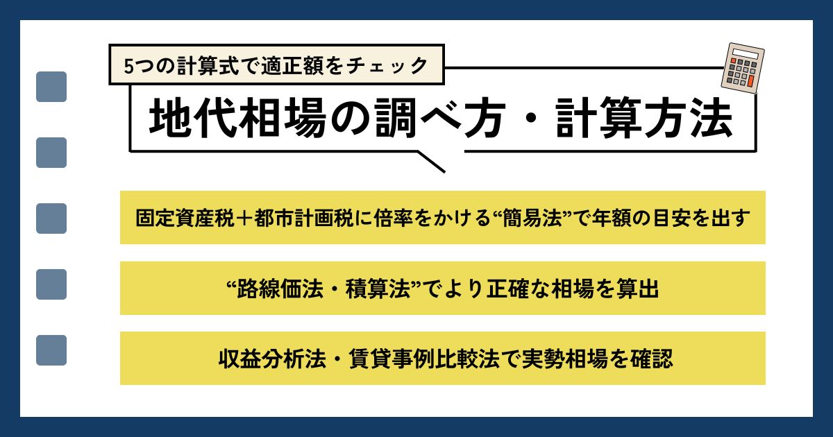 地代の相場を知るのは比較的簡単ですが、適正な地代を計算するのは複数の方法があり複雑です。