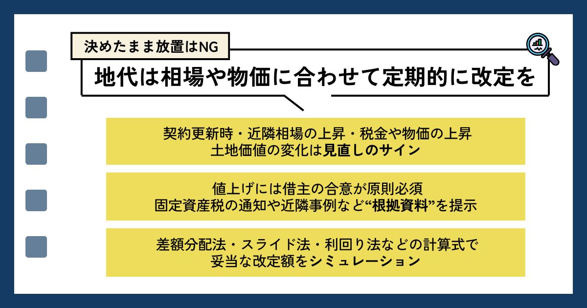 周辺の地代の相場や経済状況などを総合的に判断して、地代の見直しをおこない、妥当な収益を得るようにしてください。