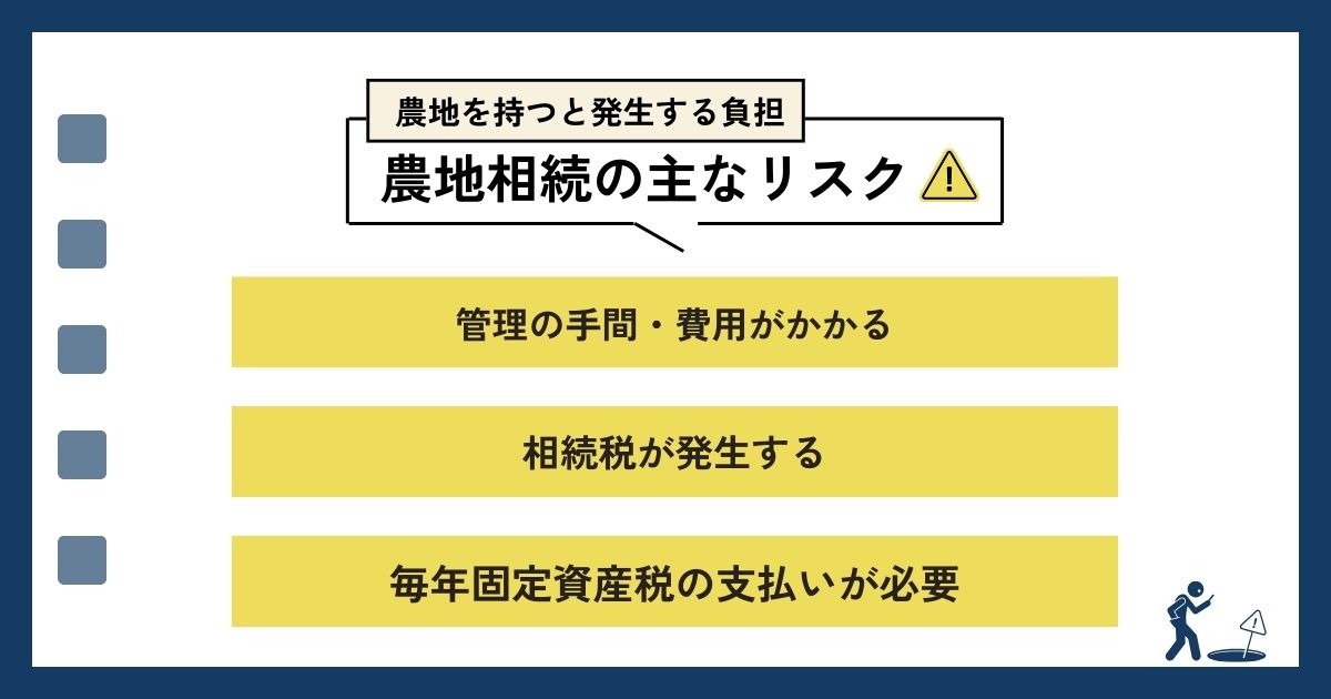農地を相続したものの、自身では使い道がない場合、管理の手間や税金の支払いなどが負担に感じるリスクがあります。