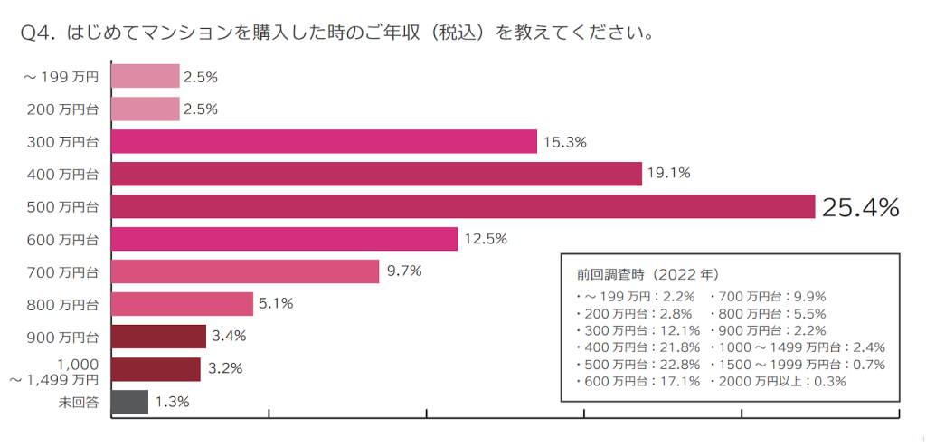 上記のとおり、マンションを購入した独身女性では、年収500万円の方が最も多く、全体の25.4%を占めています。